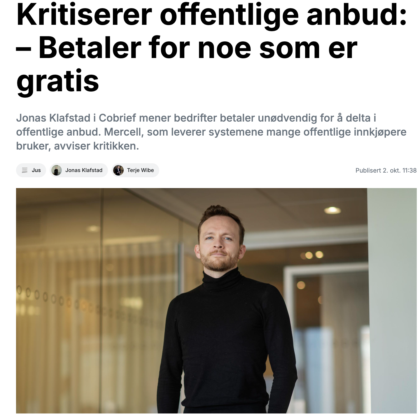 Nylig ble vår daglige leder, Jonas Klafstad, intervjuet av Finansavisen i bilaget Kapital Jus om et stort problem i anbuds-Norge: Mange bedrifter betaler titusenvis av kroner for tilgang til konkurransegrunnlagene for offentlige anbud. Ifølge loven skal dette være gratis, direkte og ubegrenset tilgjengelig. Er det virkelig det når leverandører opplever at de må betale for å få tilgang?